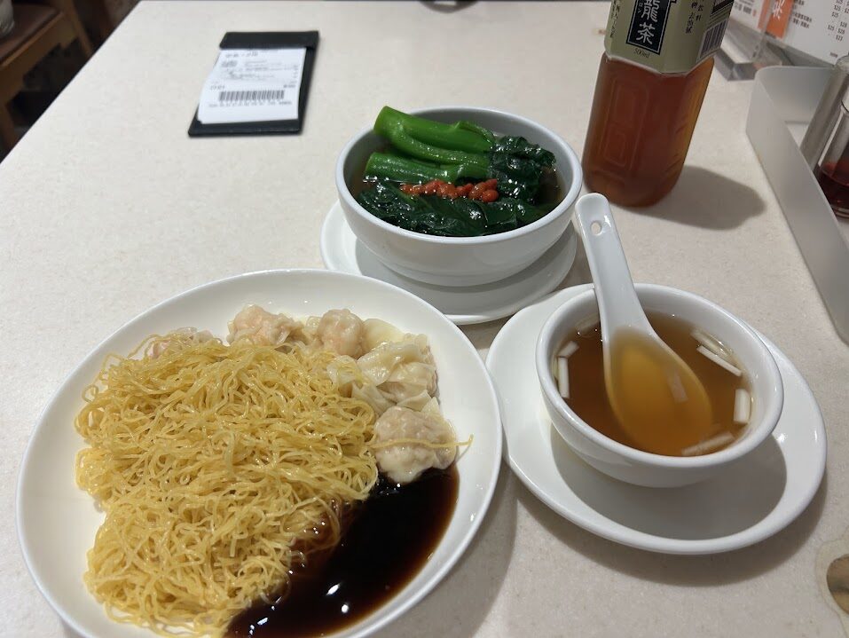 ワンタン麺と、カイランという中国南部で有名な野菜のスープもつけてみました。